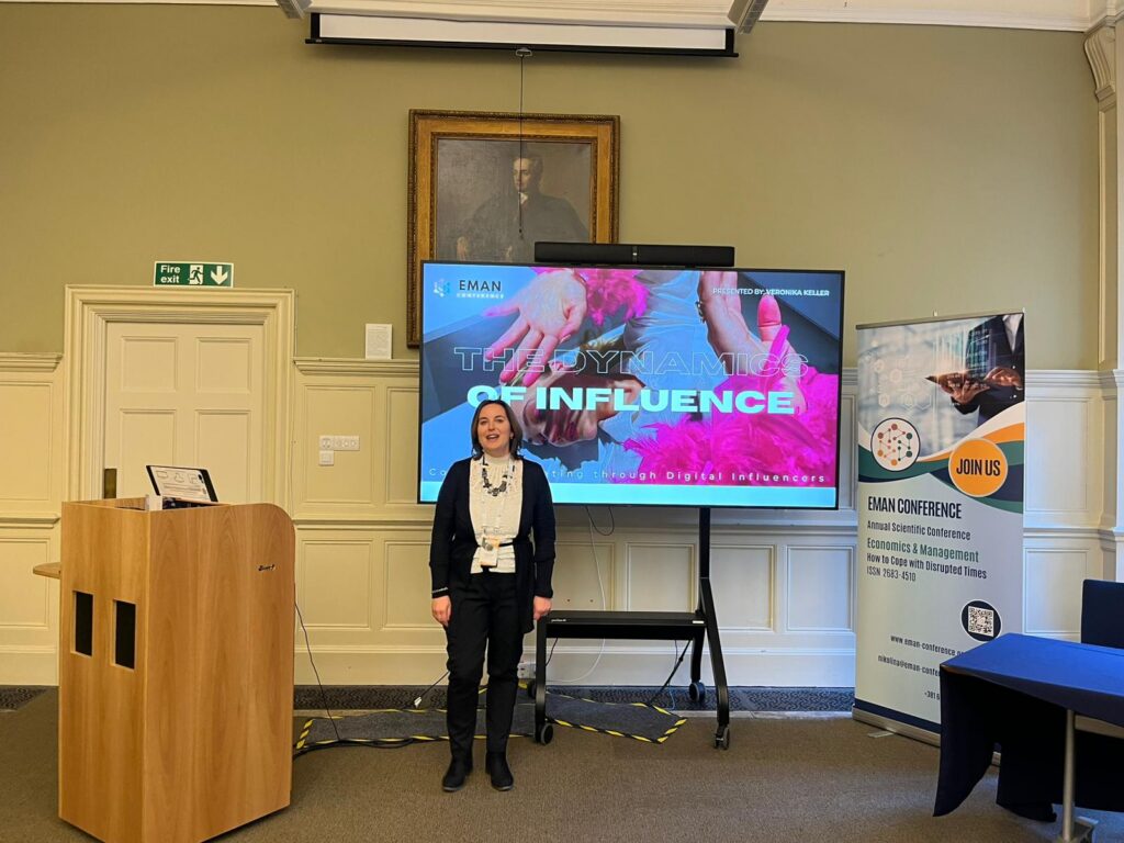 Dr. Veronika Keller, Associate Professor, introduced the audience to the world of TikTok and Instagram influencers in her presentation, “Influence and Content Marketing: Consumer Perception of Influencer Marketing Strategies.” Using a mixed-methods approach (content analysis, in-depth interviews, and a survey of 200 participants), the study compared the effectiveness of human influencers with that of AI-generated virtual influencers. Although virtual opinion leaders offer cost-effective and highly controllable solutions for brands, Generation Z still prioritizes human connection, emotional bonding, and authenticity. While excessive promotional content reduces trust in both types, engagement remains stronger with real-life influencers.