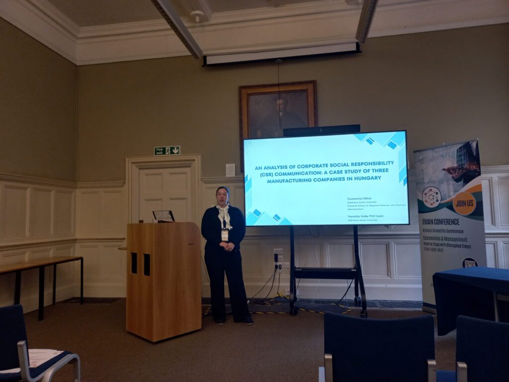 Zsuzsanna Miksó, a PhD student at the Doctoral School of Regional Sciences and Business Administration (RGDI), presented an analysis of corporate social responsibility (CSR) communication titled: “An Analysis of Corporate Social Responsibility (CSR) Communication: A Case Study of Three Manufacturing Companies in Hungary.” In her presentation, she examined consumer skepticism through the examples of three multinational manufacturing companies operating in Hungary. The research highlighted the tension between “marketing tools” versus “genuine responsibility,” particularly regarding the employment of people with disabilities. The results suggest that young adults find CSR messages credible only when they are closely linked to the company’s core activities and supported by transparent data (e.g., actual employment instead of paying rehabilitation contributions).