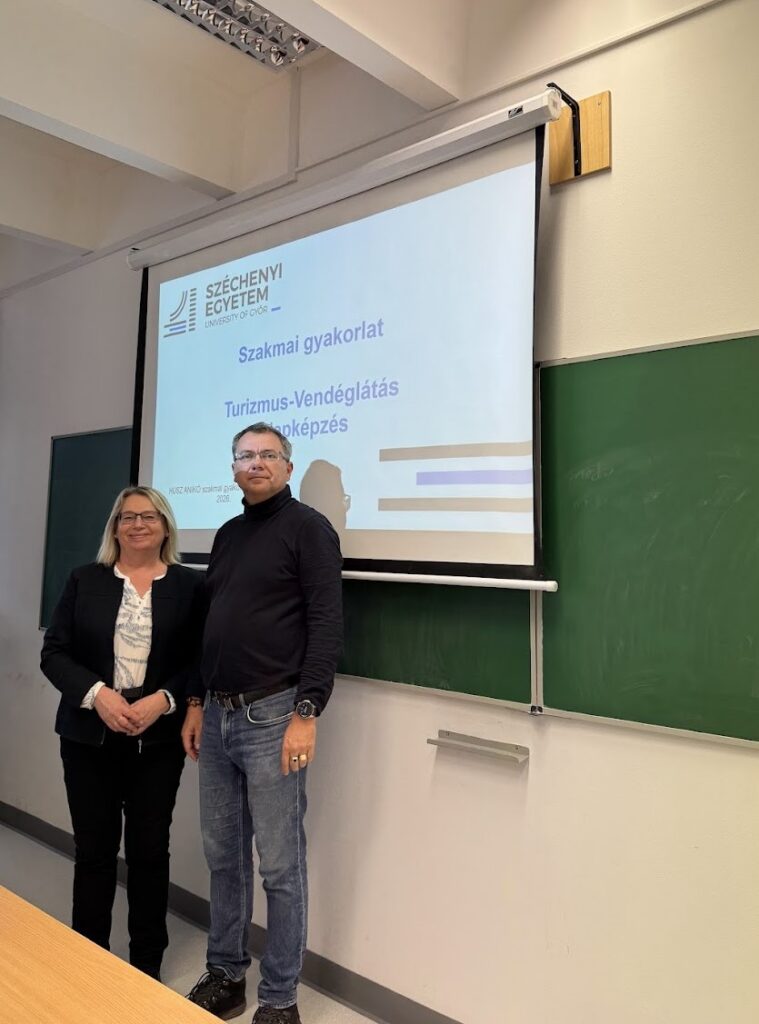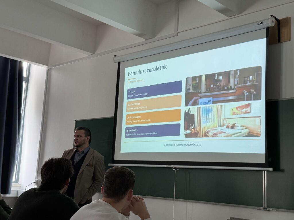 A Turizmus-Vendéglátás szakos hallgatók hasznos információkat hallhattak a következő félévben esedékes szakmai gyakorlatról 2026. február 23-án. Dr. Darabos Ferenc szakfelelős köszöntője után Neumann Ádám, a Pannon Famulus Kft. ügyvezetője beszélt az egyetemhez tartozó gyakorlati oktatóhelyek (Hotel Famulus, Apátúr Söröző, Sieger Sportbár, Elixír Bár) gyakornoki programjáról. Husz Anikó, a szakmai gyakorlatokért felelős mesteroktató ismertette a szakmai gyakorlatok követelményeit és válaszolt a hallgatók kérdéseire.